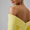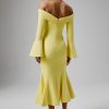 Elevate your formal attire with our Ponte Off Shoulder Fluted Sleeve Midi Dress. Made from premium Ponte fabric in a bright yellow hue, this dress boasts an elegant off shoulder wrap neckline with a stylish wrap detail and long fluted sleeves for a touch of femininity. The fit-and-flare silhouette is finished with a graceful fishtail hemline, offering a sophisticated touch that’s ideal for spring weddings, ladies’ day, or any formal event. Make a bold statement and add a pop of colour to your wardrobe with this must-have dress.