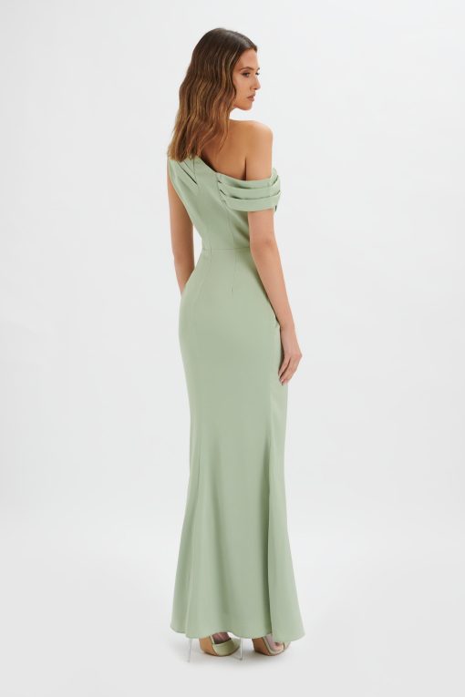 Hand crafted from our lustrous heavyweight duchesse satin, our ANNABELLA Satin Asymmetric Drape Maxi Dress in Sage Green is the perfect dress for any upcoming bridesmaids. In a beautiful shade of sage green, this maxi dress delicately cinches the torso & accentuates your curves whilst a feminine, asymmetric neckline is draped to perfection for ultimate elegant simplicity.