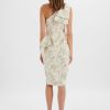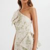 Expertly crafted with a close to body fit, this BLOOM midi dress features a stunning one shoulder design with a delicate bow detail. Made with luxurious bonded satin, the green porcelain print is accentuated by pleat details for a sophisticated touch. Perfect for any occasion.
