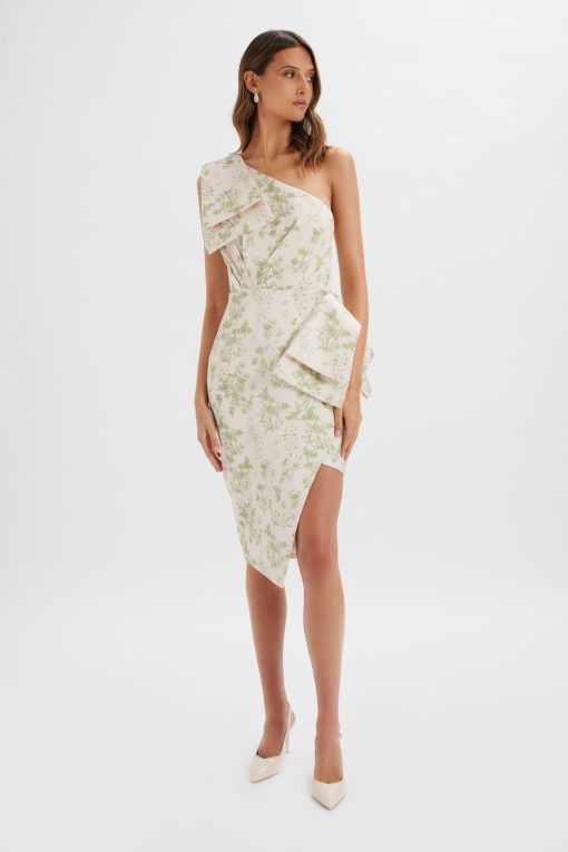 Expertly crafted with a close to body fit, this BLOOM midi dress features a stunning one shoulder design with a delicate bow detail. Made with luxurious bonded satin, the green porcelain print is accentuated by pleat details for a sophisticated touch. Perfect for any occasion.