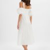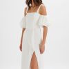 Expertly crafted from premium broderie fabric in a crisp white hue, the CHARLI Off Shoulder Dress exudes a sense of effortless elegance. The balloon puff sleeves and bardot neckline add a touch of femininity, while the midi skirt with a side split flatters any figure. Perfect for spring and garden parties.