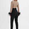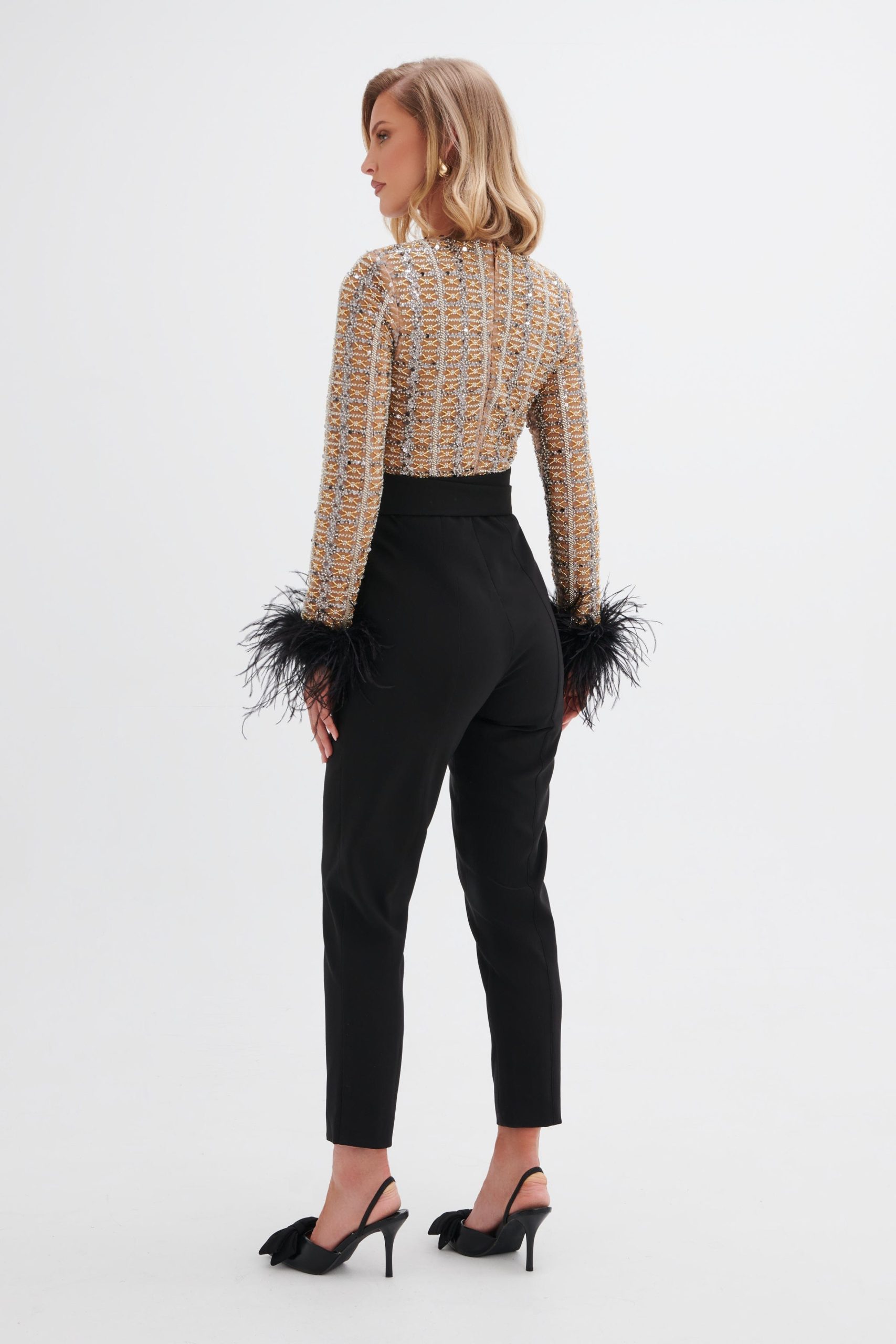 Elevate your evening wardrobe with our DELIA Embellished Feather Cuff Jumpsuit in Black. This exquisite piece blends glamour and sophistication with its stunning mix of sequin embellishments and embroidered sheer fabric on the upper body, paired seamlessly with high-quality tailored crepe trousers. Designed for elegance, the luxurious ostrich feather cuffs add a touch of opulence, while the self-fabric obi belt cinches the waist for a flattering fit. Timeless and versatile, the DELIA jumpsuit in classic black is perfect for any formal occasion or special event.