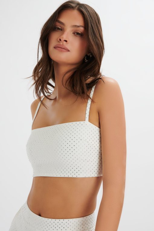 Elevate your style with the DINA Crystal Embellished Bandeau in White. This glamorous and chic bandeau features dazzling crystal embellishments that add a touch of premium elegance to your outfit. Pair it effortlessly with our ELLISA crystal embellished trousers for a stunning coordinated ensemble, or simply style it with jeans for a more casual yet sophisticated look.