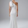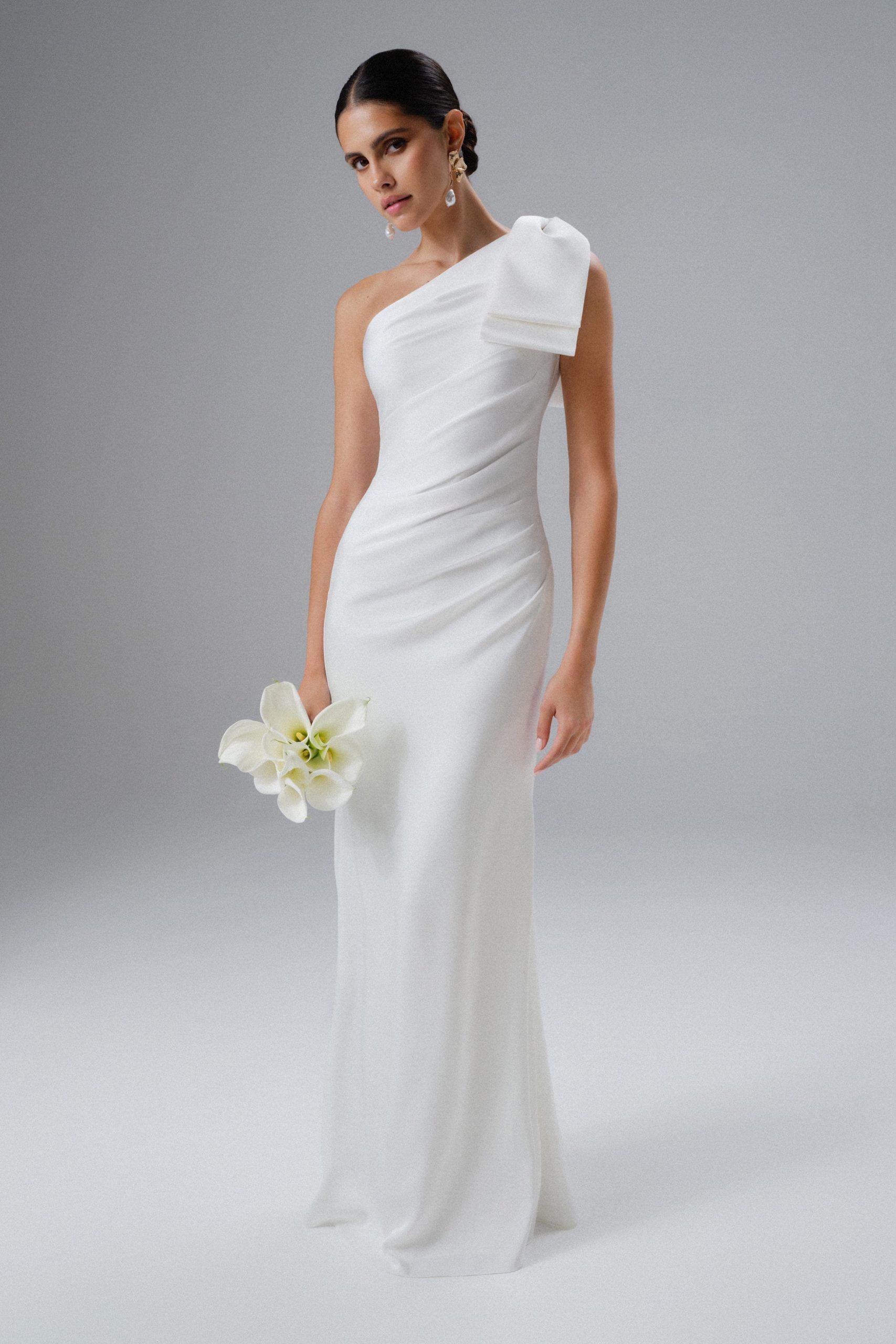 Sculptural elegance meets modern romance in the EMELIA maxi dress. Crafted from our luxurious white satin, this floor-length gown is designed to captivate with its sleek silhouette and statement details.The one-shoulder neckline is elevated by a bold, structured bow—expertly crafted from double-layer bonded satin for a flawless, sculpted finish. Soft pleating enhances the bodice and waistline, creating a figure-skimming shape that flatters from every angle.Minimal yet impactful, EMELIA is the perfect choice for bridal moments, elevated events, or any occasion that calls for refined drama.