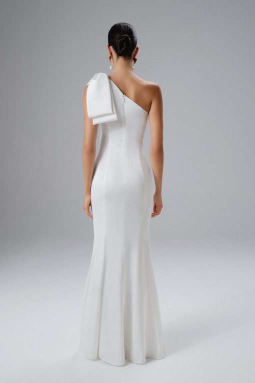 Sculptural elegance meets modern romance in the EMELIA maxi dress. Crafted from our luxurious white satin, this floor-length gown is designed to captivate with its sleek silhouette and statement details.The one-shoulder neckline is elevated by a bold, structured bow—expertly crafted from double-layer bonded satin for a flawless, sculpted finish. Soft pleating enhances the bodice and waistline, creating a figure-skimming shape that flatters from every angle.Minimal yet impactful, EMELIA is the perfect choice for bridal moments, elevated events, or any occasion that calls for refined drama.