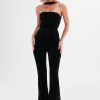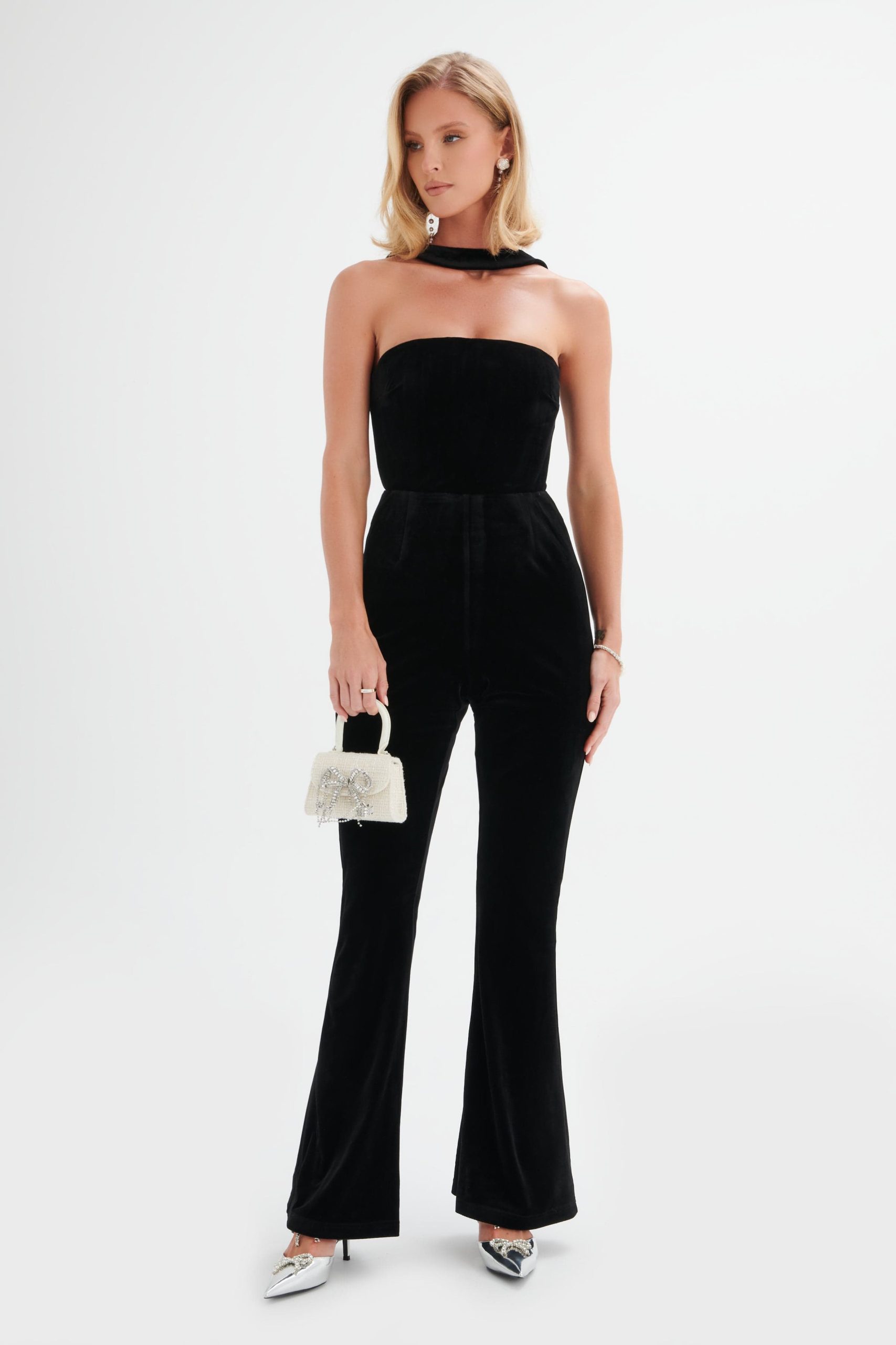 Indulge in luxury with our HAZEL High Neck Velvet Jumpsuit, a masterpiece of timeless elegance and modern sophistication. Crafted from sumptuous black velvet, this jumppsuit features a sleek curved bandeau neckline and high neckband, creating a refined silhouette. The fit-and-flare leg and daring low back with a chic cut-out add a touch of modern elegance. Perfect for upscale dinners, soirées, and formal occasions, the HAZEL Jumpsuit guarantees a lasting impression. Also available in a midi dress option.