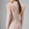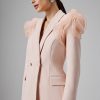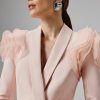 Our IVY Organza Rose Sleeve Blazer in Light Pink is the perfect addition to your formal wardrobe. Crafted from premium crepe, its classic silhouette and lapel design exude timeless elegance. The statement organza rose on the shoulder sleeves adds a touch of romantic charm, while the functional self fabric covered buttons and jet pocket with flap offer practicality. Be ready to make a statement in this sleek and sophisticated blazer.
