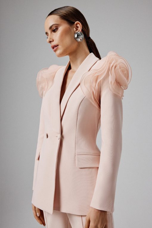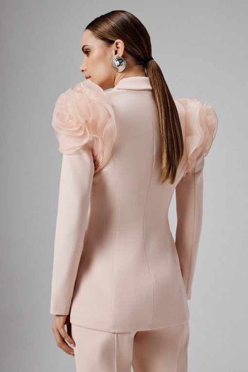 Our IVY Organza Rose Sleeve Blazer in Light Pink is the perfect addition to your formal wardrobe. Crafted from premium crepe, its classic silhouette and lapel design exude timeless elegance. The statement organza rose on the shoulder sleeves adds a touch of romantic charm, while the functional self fabric covered buttons and jet pocket with flap offer practicality. Be ready to make a statement in this sleek and sophisticated blazer.