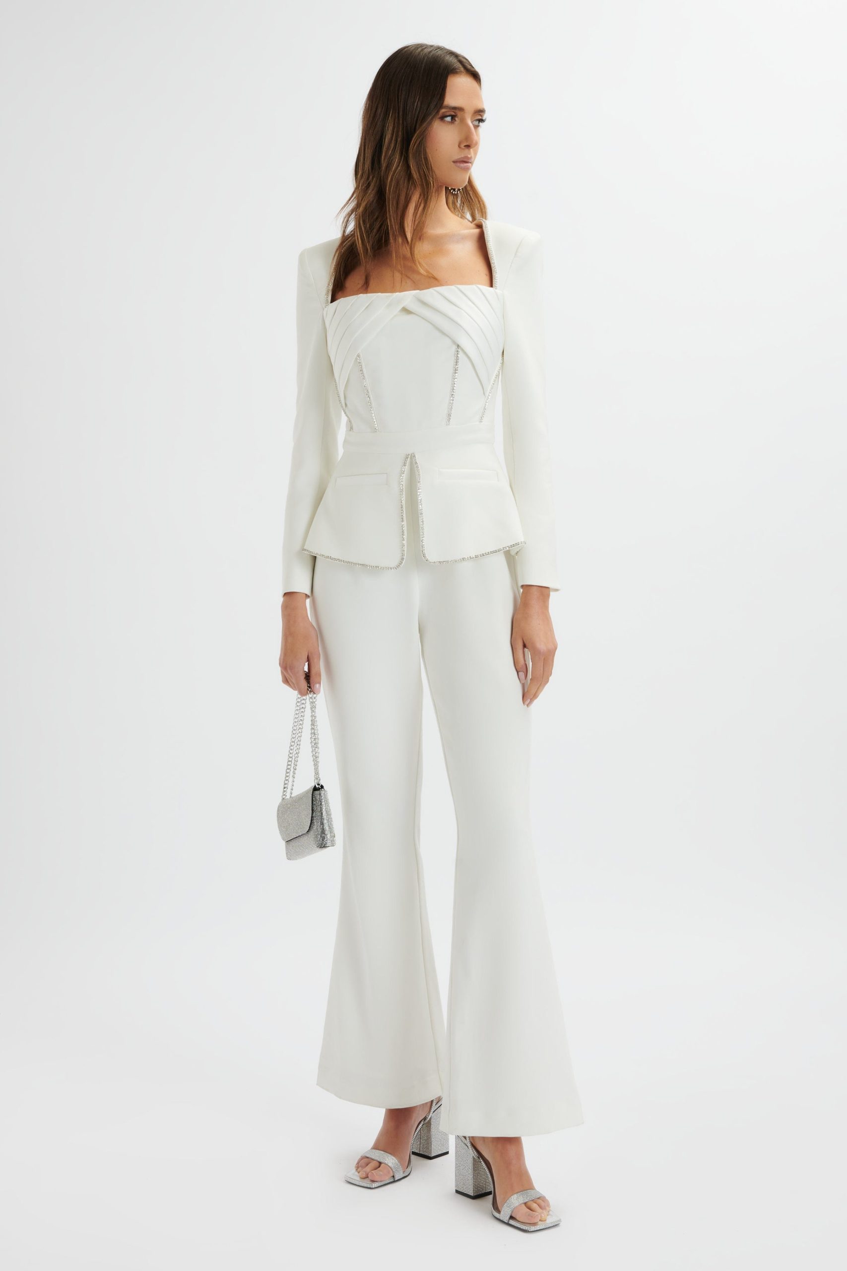 Expertly crafted with high-quality crepe in white, our JESSIE Jumpsuit lives up to its name with classic tailoring and elegant details. The contrast bonded satin pleated bust, silver diamante trim, and flattering peplum waist create a premium silhouette, while the fit-and-flare tailored trouser and pin tuck detail add elongated contour and shaping. A must-have for any formal occasion.