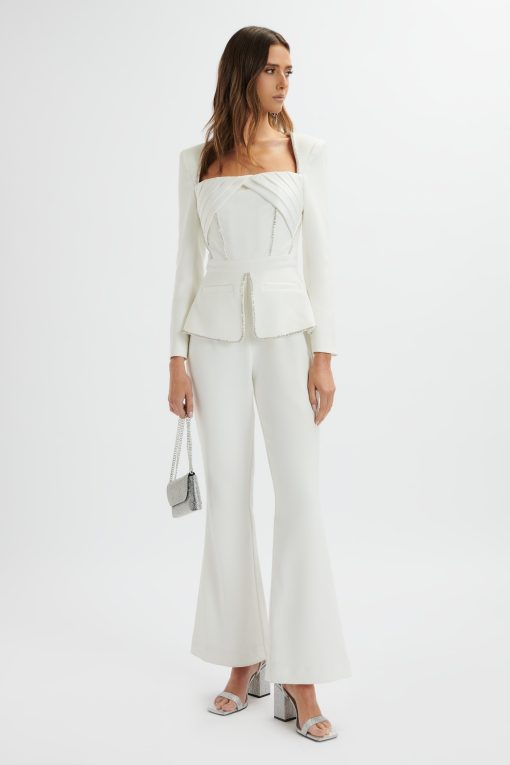 Expertly crafted with high-quality crepe in white, our JESSIE Jumpsuit lives up to its name with classic tailoring and elegant details. The contrast bonded satin pleated bust, silver diamante trim, and flattering peplum waist create a premium silhouette, while the fit-and-flare tailored trouser and pin tuck detail add elongated contour and shaping. A must-have for any formal occasion.