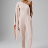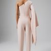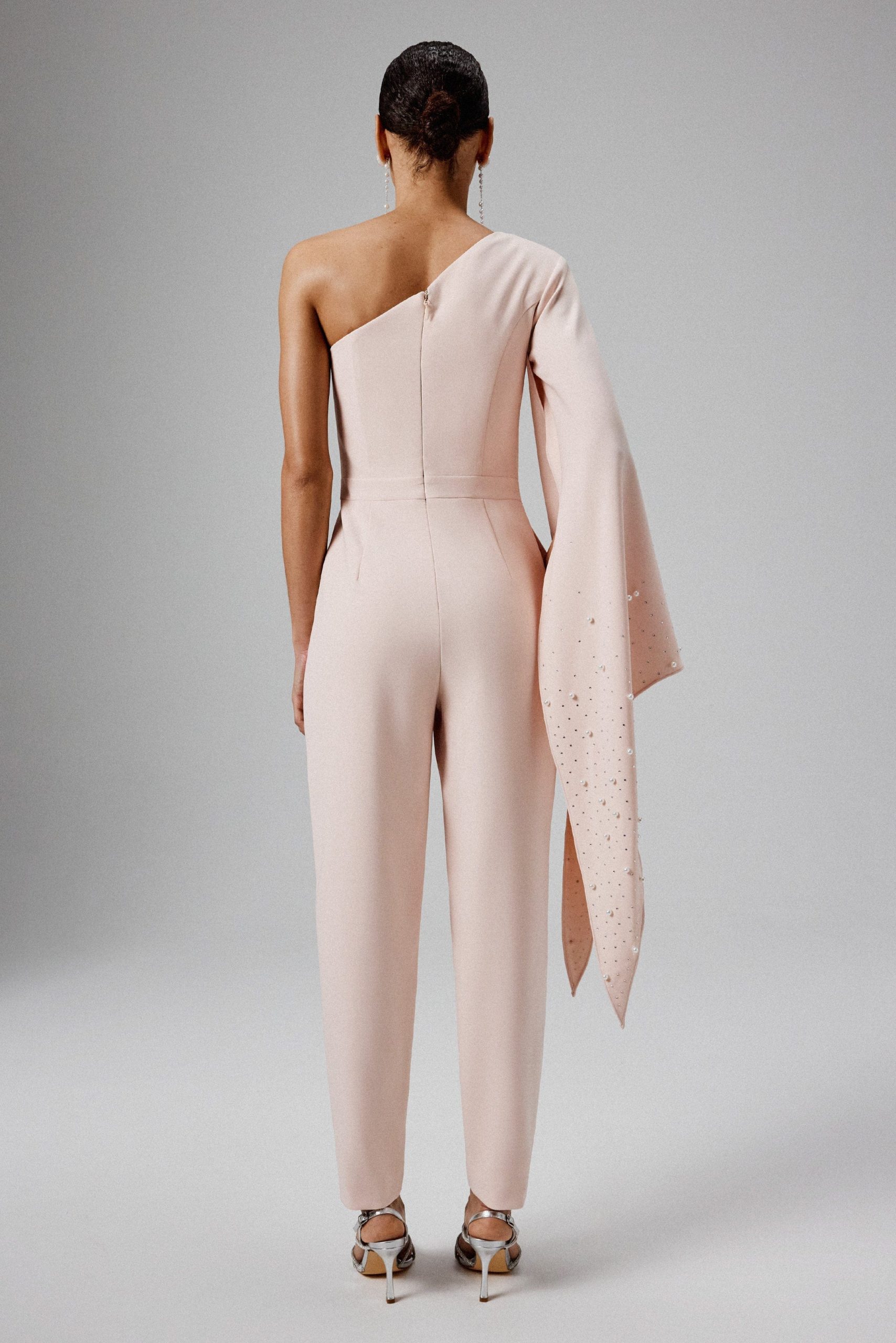 Elevate your style with the KADY Ombre Embellished One-Shoulder Jumpsuit in Pink, a perfect blend of elegance and modern flair. This luxurious jumpsuit is crafted from premium crepe fabric, featuring a chic one-shoulder neckline paired with a glamorous long cape sleeve. The sleeve is adorned with shimmering diamante and pearl embellishments, beautifully cascading in a mesmerizing ombre effect. The tailored fit of the tapered trousers enhances your silhouette, creating a sleek, polished look. Perfect for special occasions, evening events, or any formal gathering, this jumpsuit promises to deliver a head-turning look that exudes sophistication and charm.