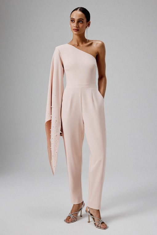 Elevate your style with the KADY Ombre Embellished One-Shoulder Jumpsuit in Pink, a perfect blend of elegance and modern flair. This luxurious jumpsuit is crafted from premium crepe fabric, featuring a chic one-shoulder neckline paired with a glamorous long cape sleeve. The sleeve is adorned with shimmering diamante and pearl embellishments, beautifully cascading in a mesmerizing ombre effect. The tailored fit of the tapered trousers enhances your silhouette, creating a sleek, polished look. Perfect for special occasions, evening events, or any formal gathering, this jumpsuit promises to deliver a head-turning look that exudes sophistication and charm.