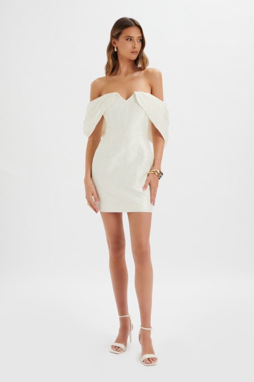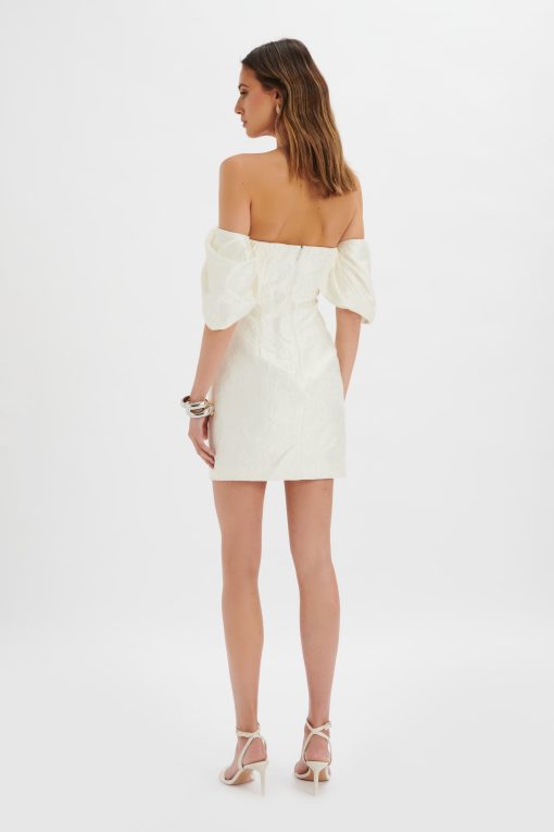 Lavish Alice Women’s Katelynn Bardot Mini Dress With Puff Sleeve In White Jacquard