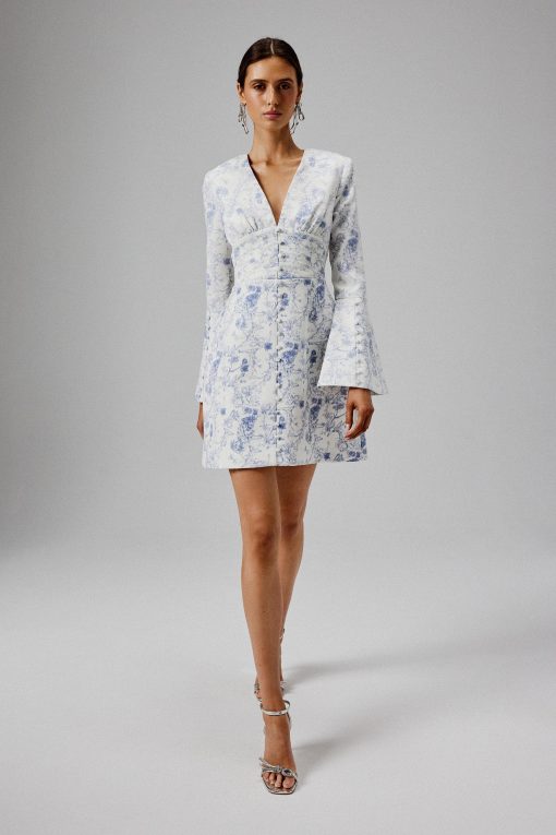 Lavish Alice Women’s Lara Fluted Sleeve Micro Button Mini Dress In Blue Porcelain