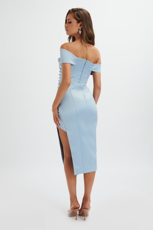 This Bardot Bandeau Pleated Midi Dress features a structured bonded satin fabrication in a refined shade of cornflower blue. The dress showcases notable pleats, fine micro button accents, and a sophisticated longline midi length. The dress boasts a flattering twisted detail neckline for added elegance. Its asymmetric hemline and high split adds glamour, making it the perfect choice for any special occasion. Concealed corsetry and boning ensure a form fitting silhouette.