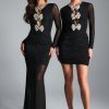 Elevate your evening look with our LYDIA Rhinestone Embellished Mesh Mini Dress in Black. This stunning piece showcases elegant, sparkling embellished mesh, complemented by unlined long sleeves and a subtly gathered skirt for a feminine silhouette. A front keyhole cutout, outlined in shimmering diamantes and adorned with a delicate bow trim, adds a touch of romance and glamour. Perfect for date nights or parties, this dress will make you stand out with its sparkling details.