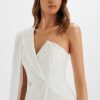 Step into the spotlight with the MARCY Crystal Embellished One Shoulder Cape Blazer Dress in White. This captivating piece exudes modern sophistication with its unique one-shoulder design and elegant cape blazer silhouette. Adorned with dazzling crystal embellishments, it adds a touch of glamour and opulence to your ensemble. Perfect for special occasions or evening events, this dress effortlessly combines chic style with statement-making elegance.