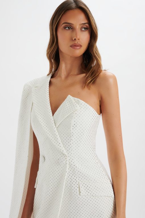 Step into the spotlight with the MARCY Crystal Embellished One Shoulder Cape Blazer Dress in White. This captivating piece exudes modern sophistication with its unique one-shoulder design and elegant cape blazer silhouette. Adorned with dazzling crystal embellishments, it adds a touch of glamour and opulence to your ensemble. Perfect for special occasions or evening events, this dress effortlessly combines chic style with statement-making elegance.