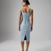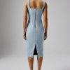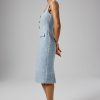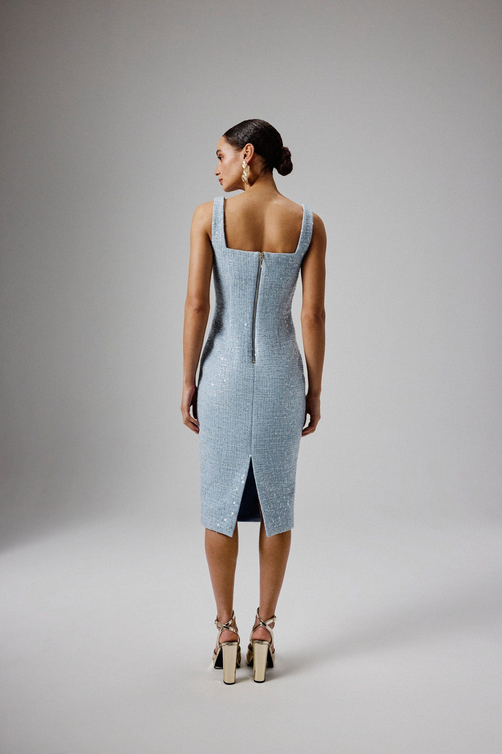 Channel sophisticated elegance in our Square Neck Boucle Midi Dress with Shell Embellishment in Blue. Tailored to perfection, this bodycon silhouette is crafted from luxurious premium boucle fabric, showcasing a chic square neckline adorned with opulent gold braided trim. Striking gold shell embellishments grace the centre front, while jet pockets with gold braided trim flaps add an extra touch of sophistication. Perfect for formal occasions, sophisticated soirées, spring weddings, or Ladies’ Day, this dress is your ultimate choice for making a memorable impression.