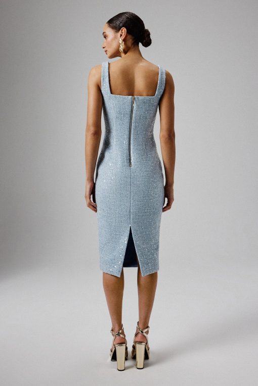 Channel sophisticated elegance in our Square Neck Boucle Midi Dress with Shell Embellishment in Blue. Tailored to perfection, this bodycon silhouette is crafted from luxurious premium boucle fabric, showcasing a chic square neckline adorned with opulent gold braided trim. Striking gold shell embellishments grace the centre front, while jet pockets with gold braided trim flaps add an extra touch of sophistication. Perfect for formal occasions, sophisticated soirées, spring weddings, or Ladies’ Day, this dress is your ultimate choice for making a memorable impression.