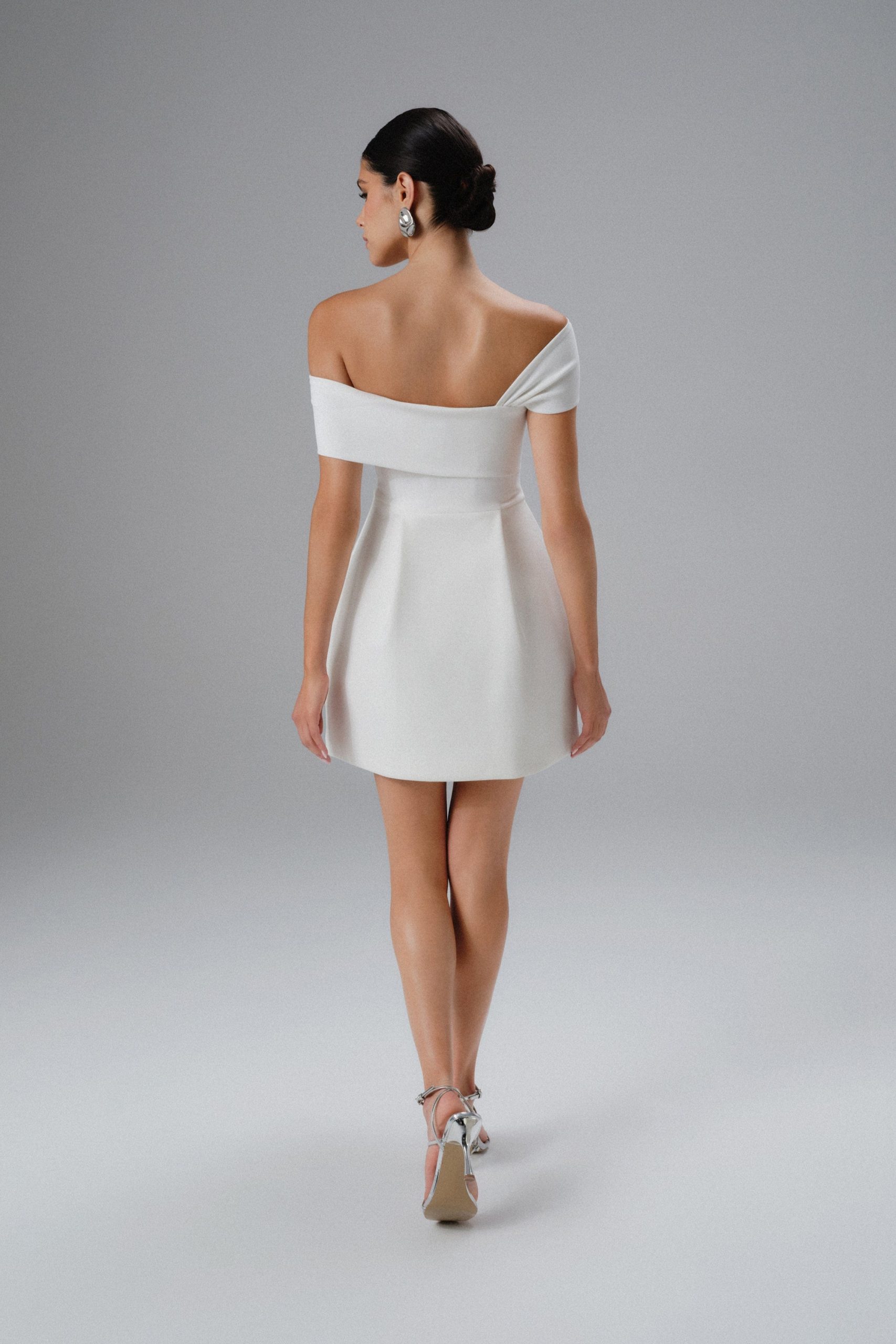A signature silhouette, reimagined in timeless white. Our MILA dress is crafted from luxurious premium crepe and features an artfully twisted one-shoulder neckline that exudes modern elegance. The tailored, close-to-body fit and sculpted mini skirt create a refined, feminine shape, while discreet side seam pockets add subtle practicality. Perfect for cocktail evenings, formal gatherings, or bridal celebrations —pair with delicate heels and understated accessories for an effortlessly refined look.