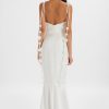 The NOVIE Floral Strap Satin Fit and Flare Maxi Dress in Ivory is an elegant choice for special occasions. Made with premium satin, it features a flattering fit and flare fishtail hemline with a centre front split. The spaghetti straps are adorned with 3D flower details, complemented by a larger flower detailing on the shoulder trim. With a low back and pleated waistline, this dress will make you feel both stylish and beautiful. Perfect for any formal event.