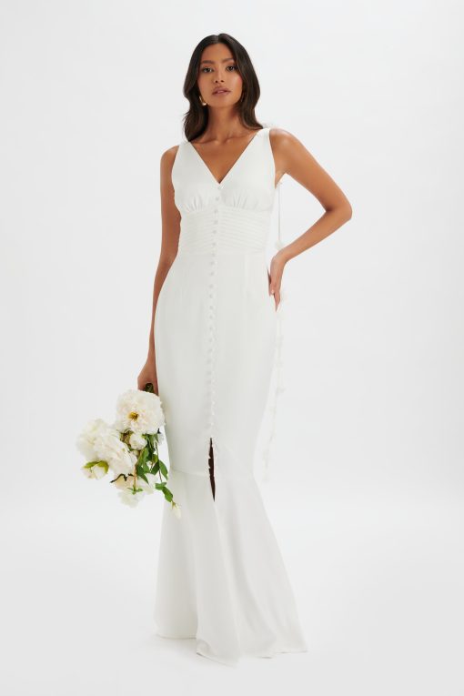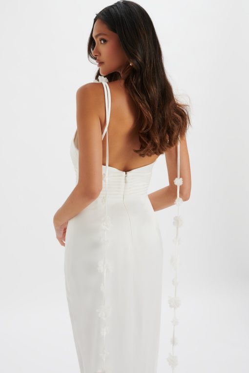 The NOVIE Floral Strap Satin Fit and Flare Maxi Dress in Ivory is an elegant choice for special occasions. Made with premium satin, it features a flattering fit and flare fishtail hemline with a centre front split. The spaghetti straps are adorned with 3D flower details, complemented by a larger flower detailing on the shoulder trim. With a low back and pleated waistline, this dress will make you feel both stylish and beautiful. Perfect for any formal event.