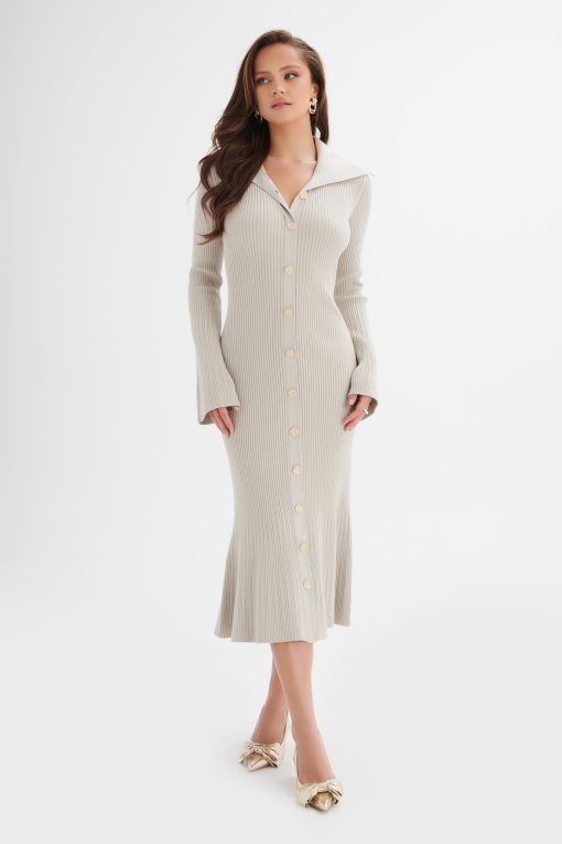 Lavish Alice Women’s Parker Knitted Ribbed Fit & Flare Collared Dress In Stone