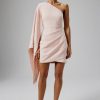 Reimagined in a romantic blush pink hue, our REMI One Shoulder Embellished Cape Mini Dress makes a stunning return for Spring.Crafted from premium crepe, this mini-length dress features a flattering wrap skirt with delicate pleat detailing. The asymmetric neckline is complemented by a flowing one-shoulder cape sleeve, beautifully adorned with an ombre embellishment of sparkling diamante and pearl beads for a touch of glamour. With a concealed shoulder pad for a sleek tailored effect and a close-to-body fit that exudes elegance, this dress is perfect for upcoming spring formal occasions.