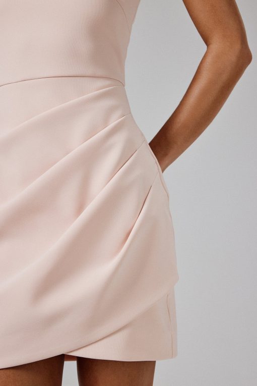 Reimagined in a romantic blush pink hue, our REMI One Shoulder Embellished Cape Mini Dress makes a stunning return for Spring.Crafted from premium crepe, this mini-length dress features a flattering wrap skirt with delicate pleat detailing. The asymmetric neckline is complemented by a flowing one-shoulder cape sleeve, beautifully adorned with an ombre embellishment of sparkling diamante and pearl beads for a touch of glamour. With a concealed shoulder pad for a sleek tailored effect and a close-to-body fit that exudes elegance, this dress is perfect for upcoming spring formal occasions.