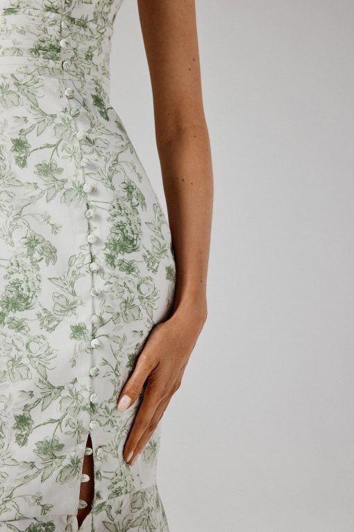 Introducing our best-selling SAFFRON High Neck Satin Midi Dress in Sage Porcelain Print. This elegant and sophisticated dress features premium crepe in a beautiful sage green porcelain print, a flattering high neck style, and a close to body fit that accentuates your silhouette. The flounced hem and pleat detail on the neckline exude elegance, while the subtle thigh split, and delicate self-fabric buttons add a touch of refinement. Spring into style with this chic midi dress, perfect for weddings, Ladies Day or any special event where you want to make a statement.