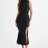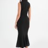 Elevate your formal wardrobe with our SAFFRON High Neck Rose Button Midi Dress in Black. Made with premium black crepe, this versatile dress offers a flattering, close to body fit with a delicate gold rose button detailing. The high neck style, midi length, and pleat detail on the neckline add to the dress’s elegant and sophisticated silhouette. Perfect for weddings, elegant dinners, or any formal occasion, this best-selling style is now available in a timeless black colourway.