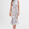 Introducing our best-selling SAFFRON High Neck Satin Midi Dress, now in a captivating navy porcelain print. Crafted from luxurious satin, this elegant dress features a chic high neck and delicate micro button detailing, adding a touch sophistication. With its flattering close-to-body fit, neckline pleats, alluring thigh split, and fit and flare design, it’s perfect for formal events and special occasions. Elevate your wardrobe effortlessly with this timeless piece.