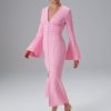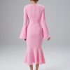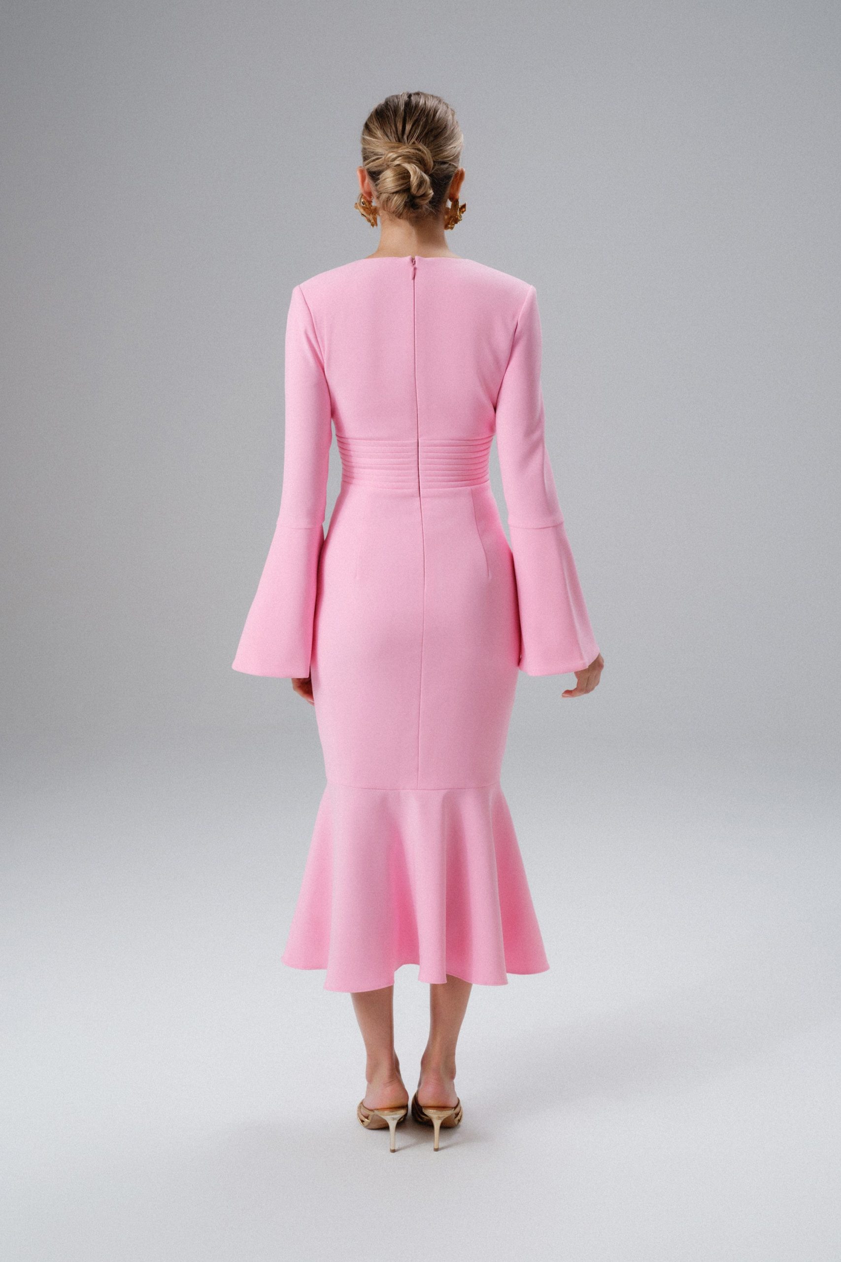 A crowd favourite, the SALMA Midi Dress , is reimagined in a vibrant pink for the perfect summer statement. Crafted from luxurious crepe, it features a close-to-body fit that sculpts your silhouette, flowing seamlessly into a flared fishtail hemline for an elegant, feminine finish. The pleated waistband cinches the waist beautifully, while gold micro rose buttons cascade down the centre front and embellish the fluted sleeves for a touch of glamour. Perfect for race season, summer events, and special occasions, SALMA is a standout piece that guarantees effortless sophistication.