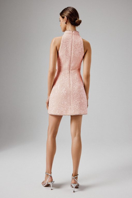 Lavish Alice Women’s Solene Sequin Boucle High Collar Mini Dress With Bow Embellishment In Pink