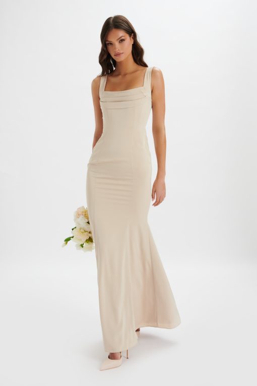 Elevate your special occasion style with our TARA Structured Satin Cowl Front Maxi Dress in Champagne. Crafted from luxurious champagne satin fabric, this dress features a flattering close to body fit and a pleated structured cowl front for a sophisticated touch. Perfect for any formal event.