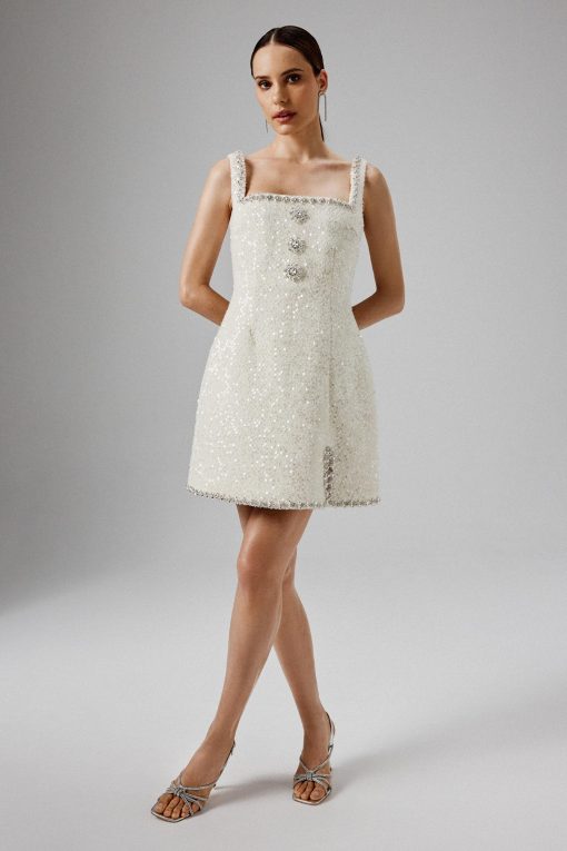 Got an upcoming cocktail night or a romantic dinner date? Look effortlessly chic in our Zoey Embellished Boucle Tulip Mini Dress in Beige—the ultimate choice for your next special occasion.This stunning mini dress features a stylish tulip skirt, enhanced with skirt fusing for added volume and flair. The square neckline, adorned with an elegant, embellished trim, exudes sophistication, while the shimmering diamante buttons at the centre front elevate the dress with a touch of luxury. With its captivating design, this dress radiates romantic charm, making it a must-have for your wardrobe.