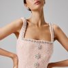 Mirroring the radiance of endless spring days, our beloved ZOEY dress makes its return in a dreamy blush pink. Meticulously crafted from luxurious boucle fabric, this mini dress exudes romance with its tulip skirt silhouette. The internal skirt fusing lends beautiful structure, while the square neckline, delicately trimmed with embellishments, adds a touch of elegance. Sparkling diamante buttons down the centre front offer a hint of glamour, completing the chic design. With its figure-flattering fit, the ZOEY dress is perfect for romantic date nights, spring celebrations, or any special occasion where you want to captivate with an effortless romantic charm.