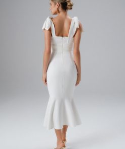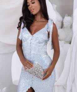 Lavish Alice Women’s Kamila Tie Strap Micro Button Crepe Midi Dress In Blue Porcelain Print